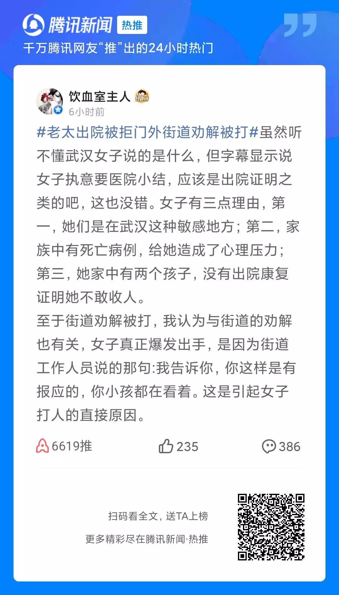 近日,武汉一名8旬老太因为疑似感染新冠肺炎被隔离,隔离完毕后发现是虚惊一场。因为老人的女儿女婿都在住院,街道办想把她送到外孙家。但她外孙和外孙媳妇却说没有见到外婆的“出院小结”,担心出问题于是拒收,街道办人员上前劝说反被打。老人只是疑似病例,隔离结束后已经被证明是健康的了,这样把她拒之门外,难免让老人寒心。不过外孙也有自己的考虑,英富软木小编到网友@饮血室主人这么认为:冲突后不久,外孙还是将老人接