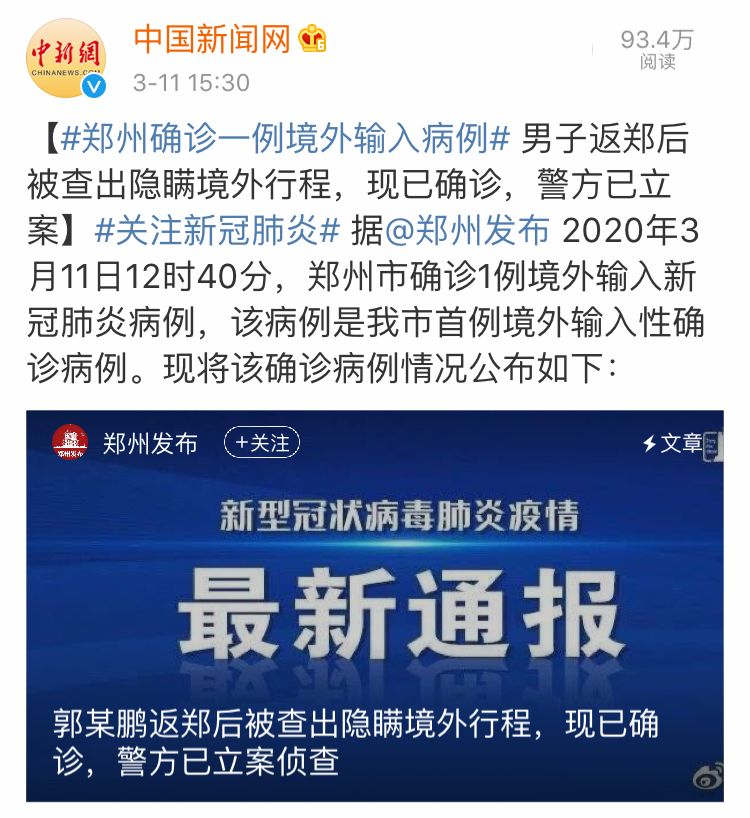 3月11日,郑州确诊了1例境外输入新冠肺炎病例。30岁的男子郭某鹏本月7日由意大利米兰途经北京转车至郑州。11号确诊,回家没问题,但刻意隐瞒了出国旅行史,还乘坐公共交通上下班,问题就大了。 郭某的母亲说,回来时也没啥症状,后来发烧就给他熬药,吃药就退烧了。