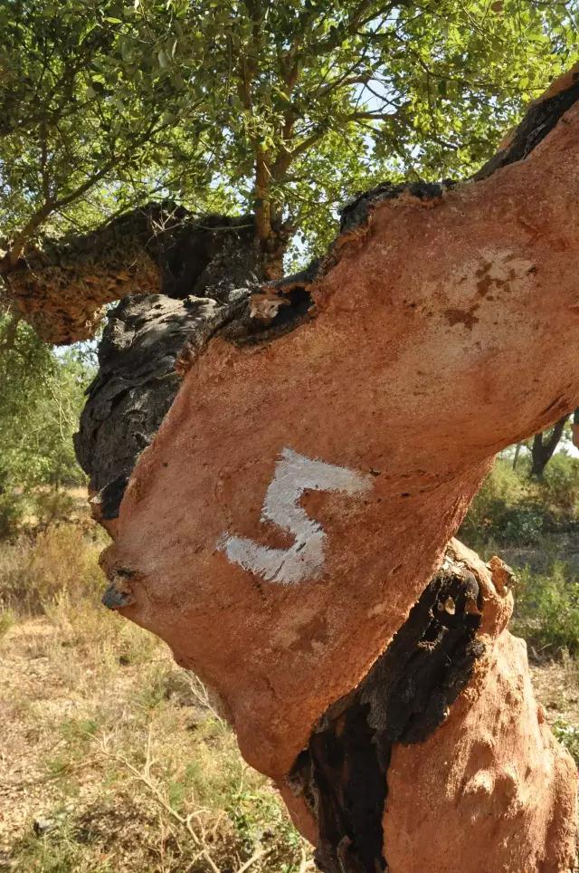 5 是代表2015年。栓皮栎每隔9 年才能采剥一次,工人们完成采剥后会在树上写上年份,清晰的标志显示农场有系统地管理栓皮栎林,保护生态环境。